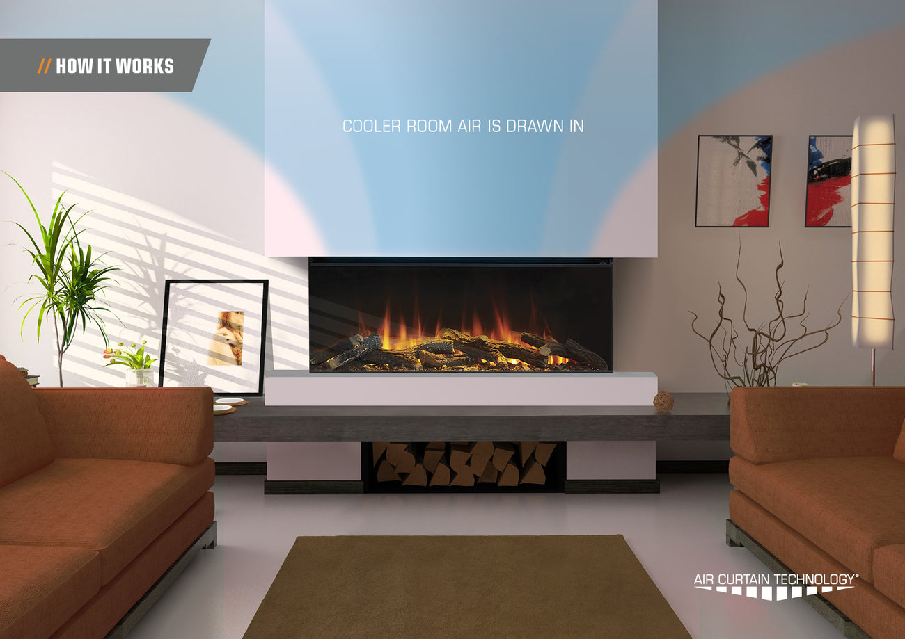 The fan draws cool air from the room in and down the sides of the fireplace.