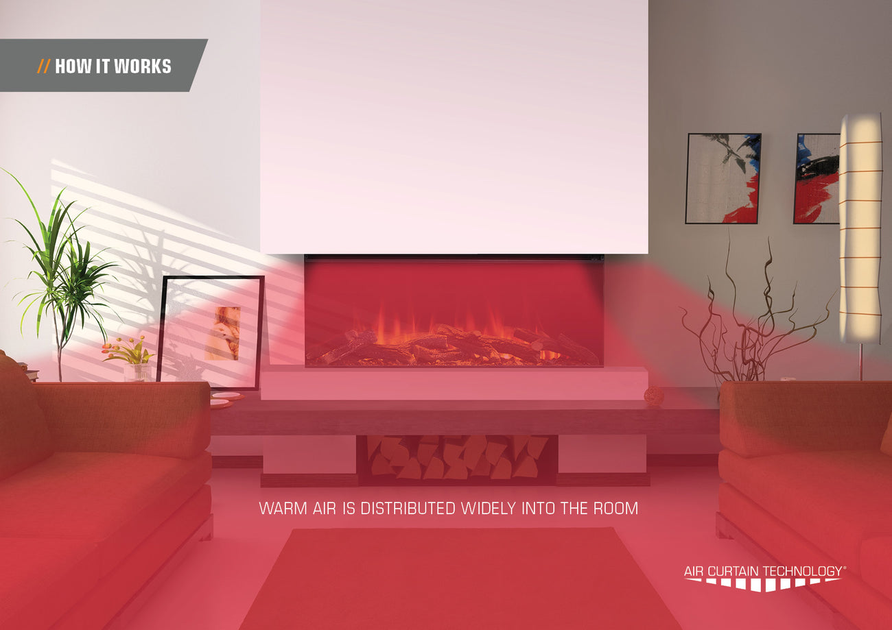 When the downlight effect is turned on, it illuminates the mirror and reflects the logs, creating a 3D effect and making the fire bed look deeper.