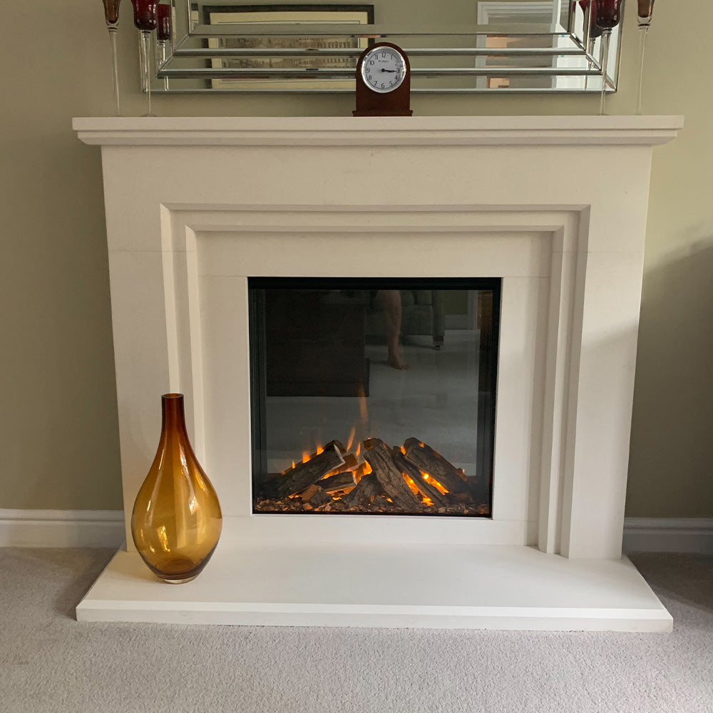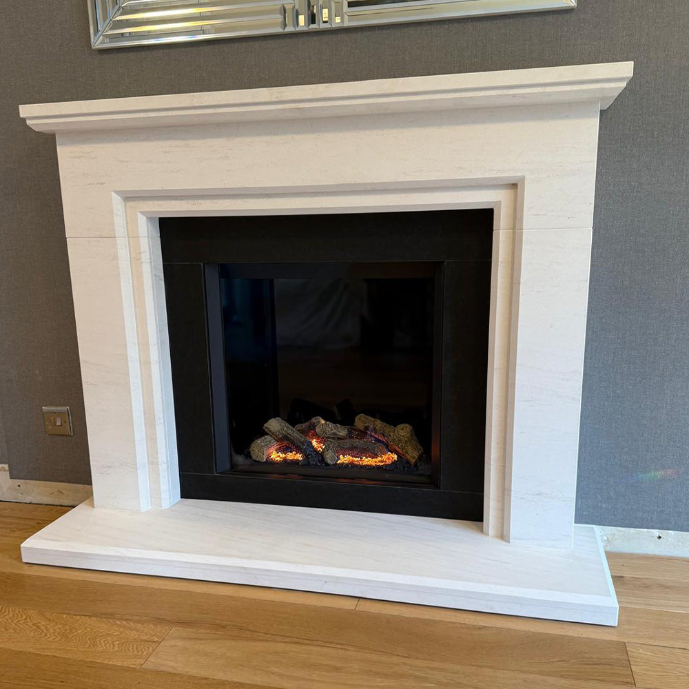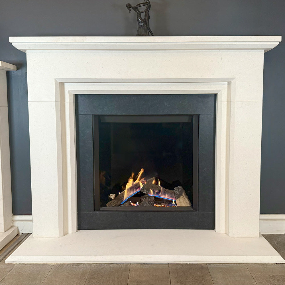 The Lefondra Limestone Fireplace Surround is a bold and contemporary surround, originally designed to complement the sleek, linear styling of the Gazco Onyx gas fire range. Its confident proportions and clean detailing make it a perfect choice for modern interiors seeking understated luxury.