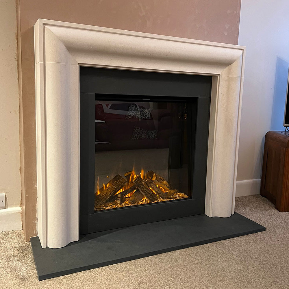 This style suits light stones and marbles and pairs particularly well with contrasting black slate or granite hearth and slips, offering a striking visual contrast.