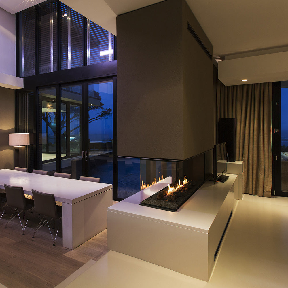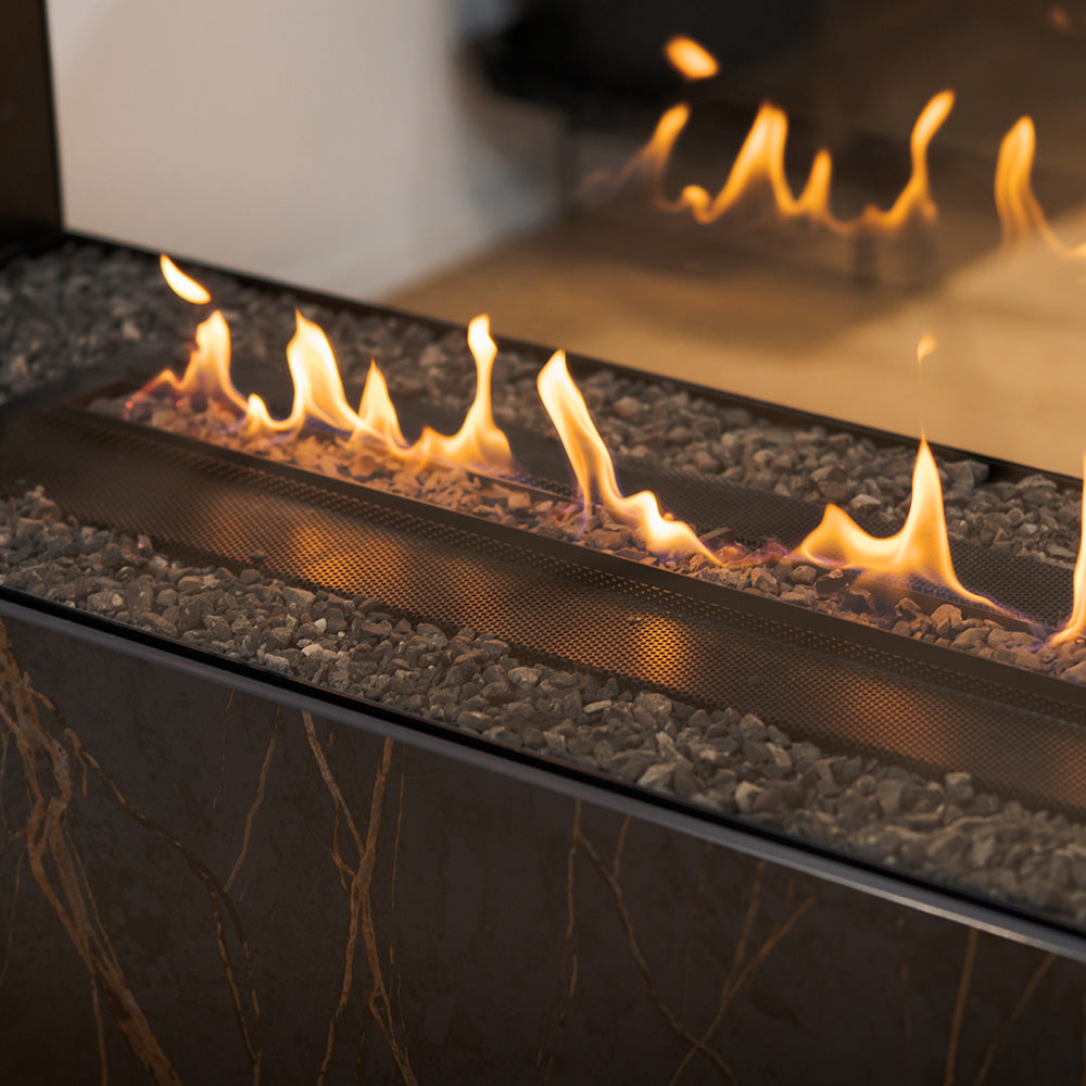 Panorama fireplace is enclosed with a durable tempered glass panels. The top surface of the fireplace can be coverd with the included glass foam pebbles to increase its aethetic value. As an option the burner can be decorated with ceramic logs or white stones.